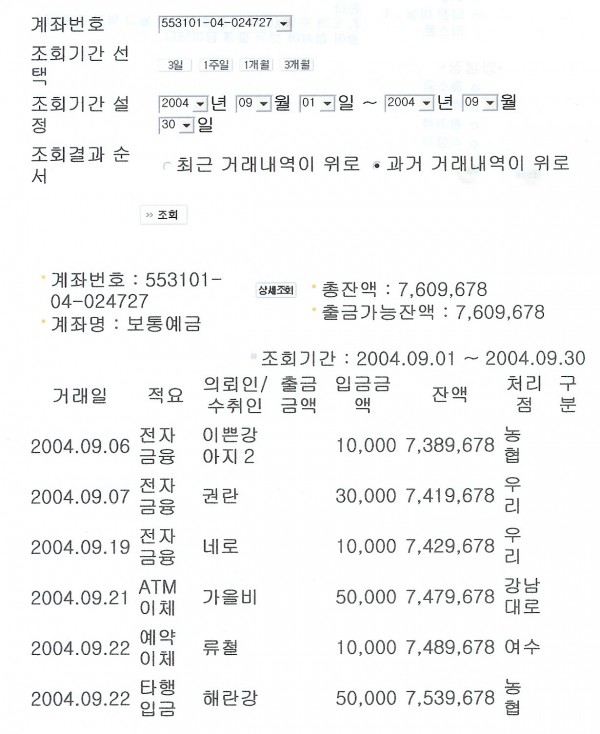 우선 계좌의 입금내용을 스켄처리하는 데 잠시 장애가 있어 먼저 수기로 내용을 올립니다.