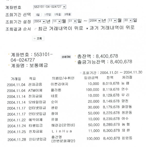 그리고 연변문화재단 운영자이신 홍건영님은 전번 11월 28일 한국지역 모임의 행사후원금으로 입금 해주셨습니다.전에 '연변예문통신'이란 사이트가 '연변통신'으로 근일내 개편되었습니다.12월 중에 행사내용과 관련 상계될 금액입니다.