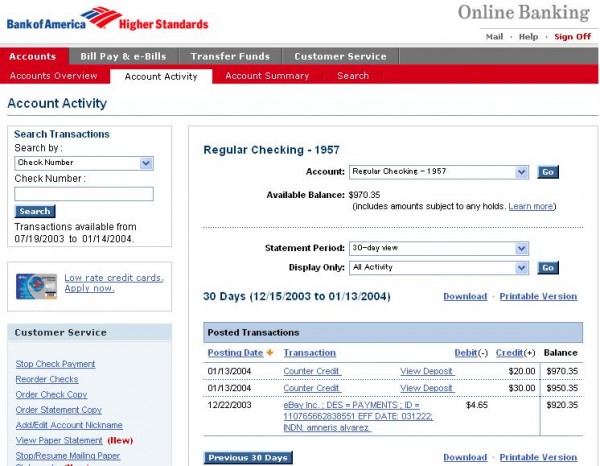 12월22일 출금 4.65불 ( 이 출금은, 이바이라는 옥크숀회사에 물건 산 비용으로 지불되었는데 저는 물건 산적이 없거던요.그래서 은행에 문의하였더니 아마 은행원의 타자실수로 잘못 지급되었을거라면서 조사해서 돌려받을수있다고 합니다.