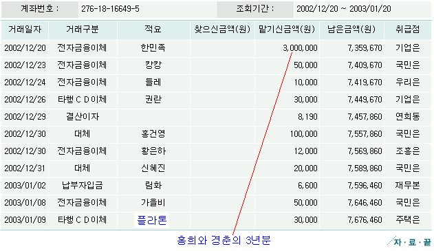 뱅킹자료에 이상이 있어서 몇자 적습니다. 12월 30일짜 조흥은행계좌에서 "황은하"로 입금된 12,000원은 제가 입금한 내역이 아닙니다. 어느 회원님께서 인터넷뱅킹을 하면서 입금자란에 예금주 명의인 제 이름을 잘못 기입하신 것 같습니다.